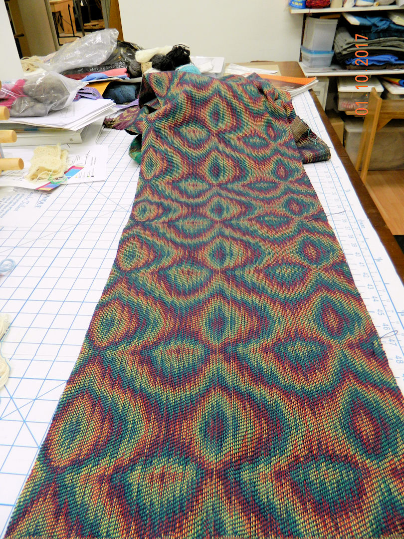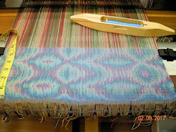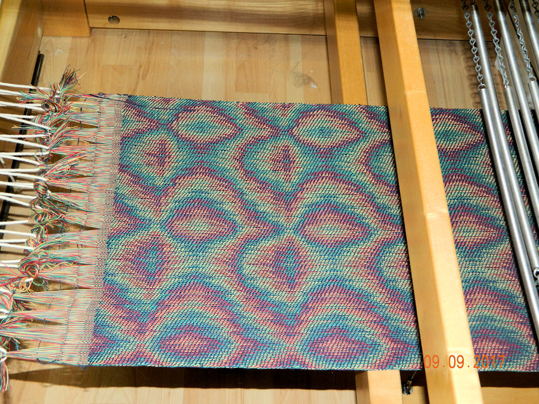 I chose the tie-up, treadling and navy weft yarn, like the second sample from the bottom above, to weave yardage to be cut into samples to exchange with the Complex Weavers study group. Here it has just reached the back of the loom.