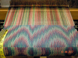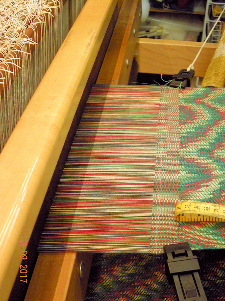 In Echo Weave a threading is designed and then "echoed" a set number of shafts away, and usually threaded in a different colour. As I have 16 shafts I was able to do three echoes of the original line, each four shafts up from the last.