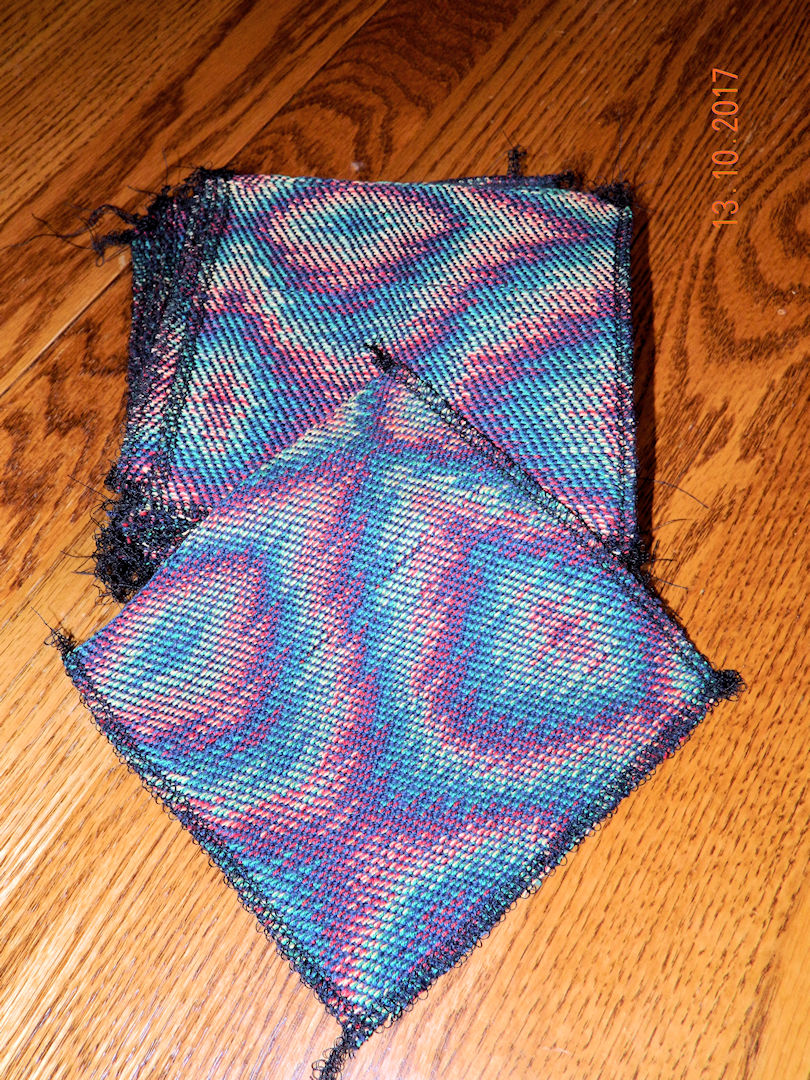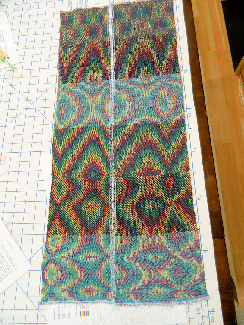 Here they have been cut off, separated and wet finished. The left side was sleyed at 54 ends per inch, the right at 45 epi. The more dense set felt more stable so the right hand threads were re-sleyed to match the left.