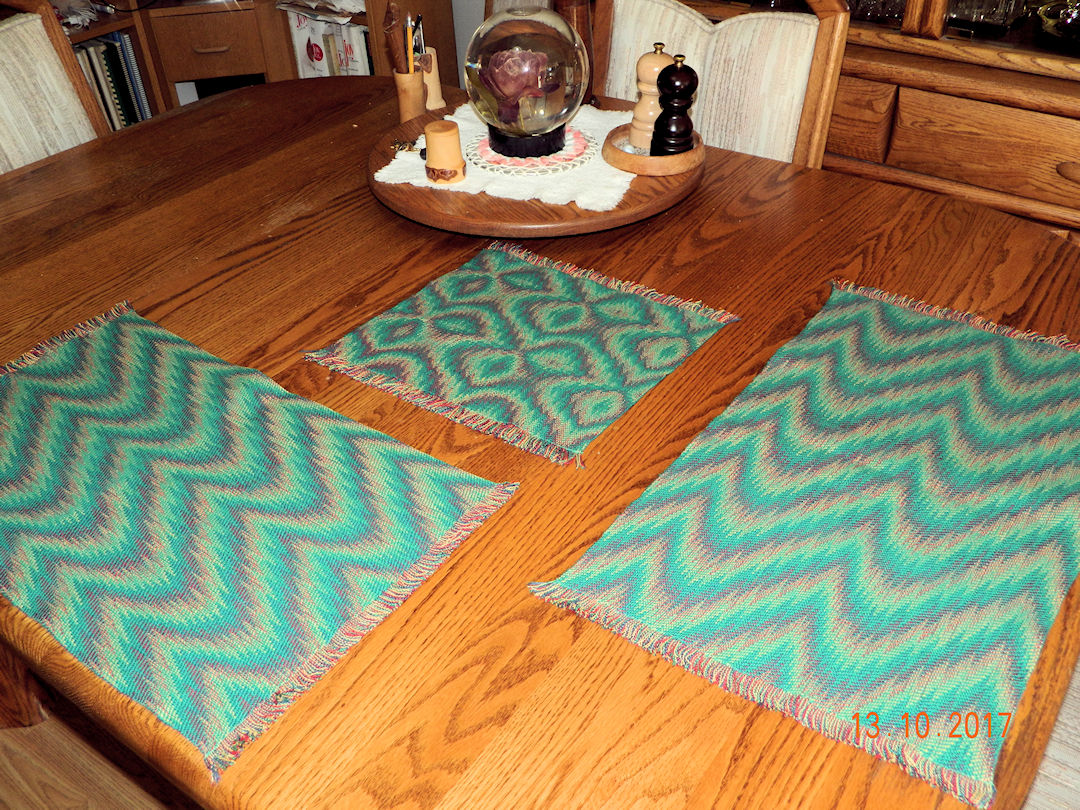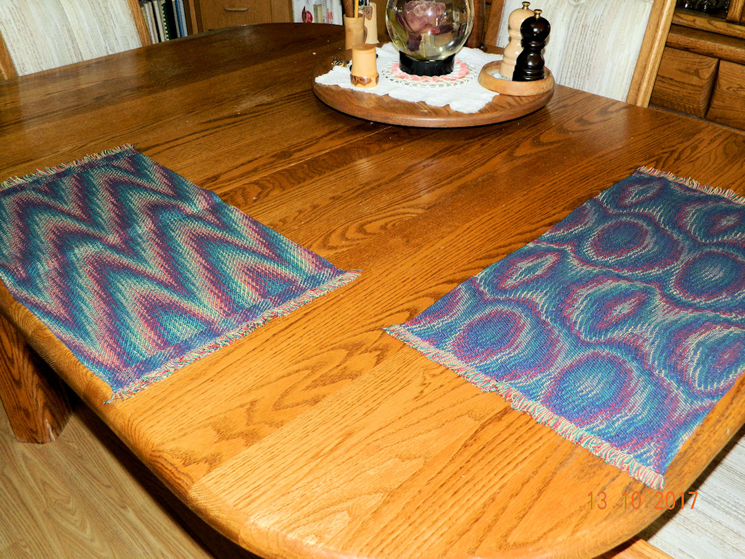 These two place mats and the small runner were woven with green weft instead of navy.