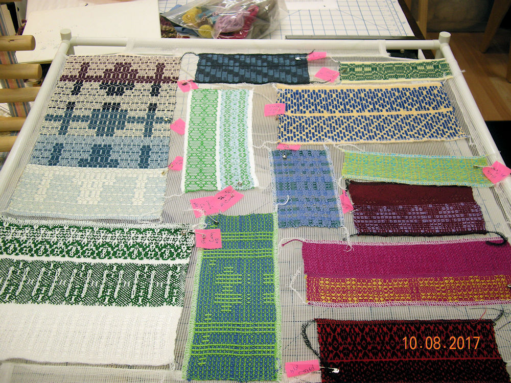 Back in July I reported on attending a workshop on "Bateman Weaves" at the ANWG conference in Victoria. But I had not woven my own sample at the time. In August I finally wove the sample on my loom - the large one at the upper left here. All of the samples have now been serged, washed and pressed so that I can tell what the finished cloth would be like.
