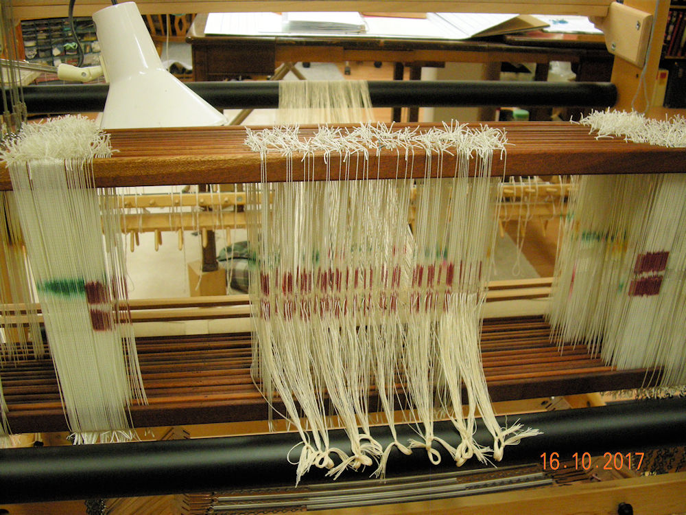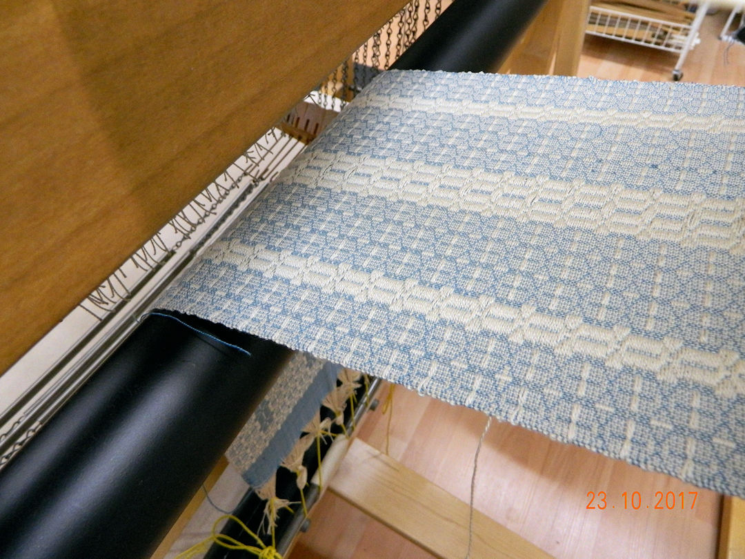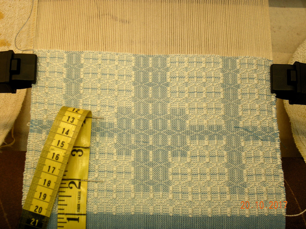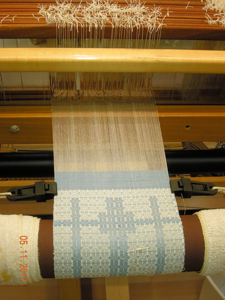Weaving underway. I chose a blue yarn the same size as the warp for the tabby weft and a fatter pattern weft that matched the warp colour.
