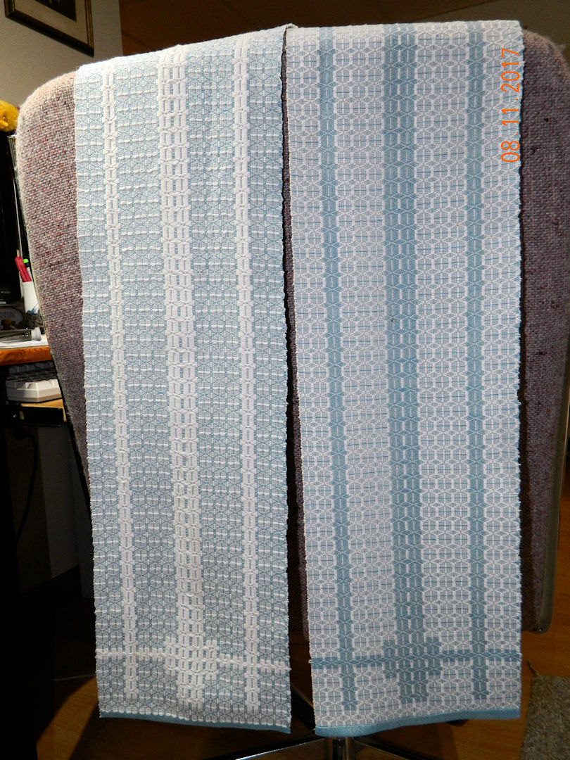 Off the loom, washed and pressed. Showing both sides. I discovered, that as I suspected while weaving, the fabric was much too firm to wear as a scarf.