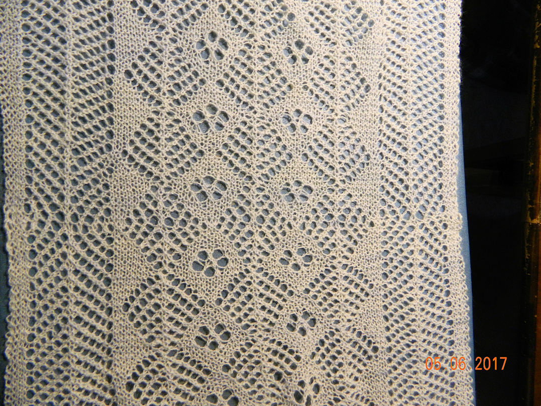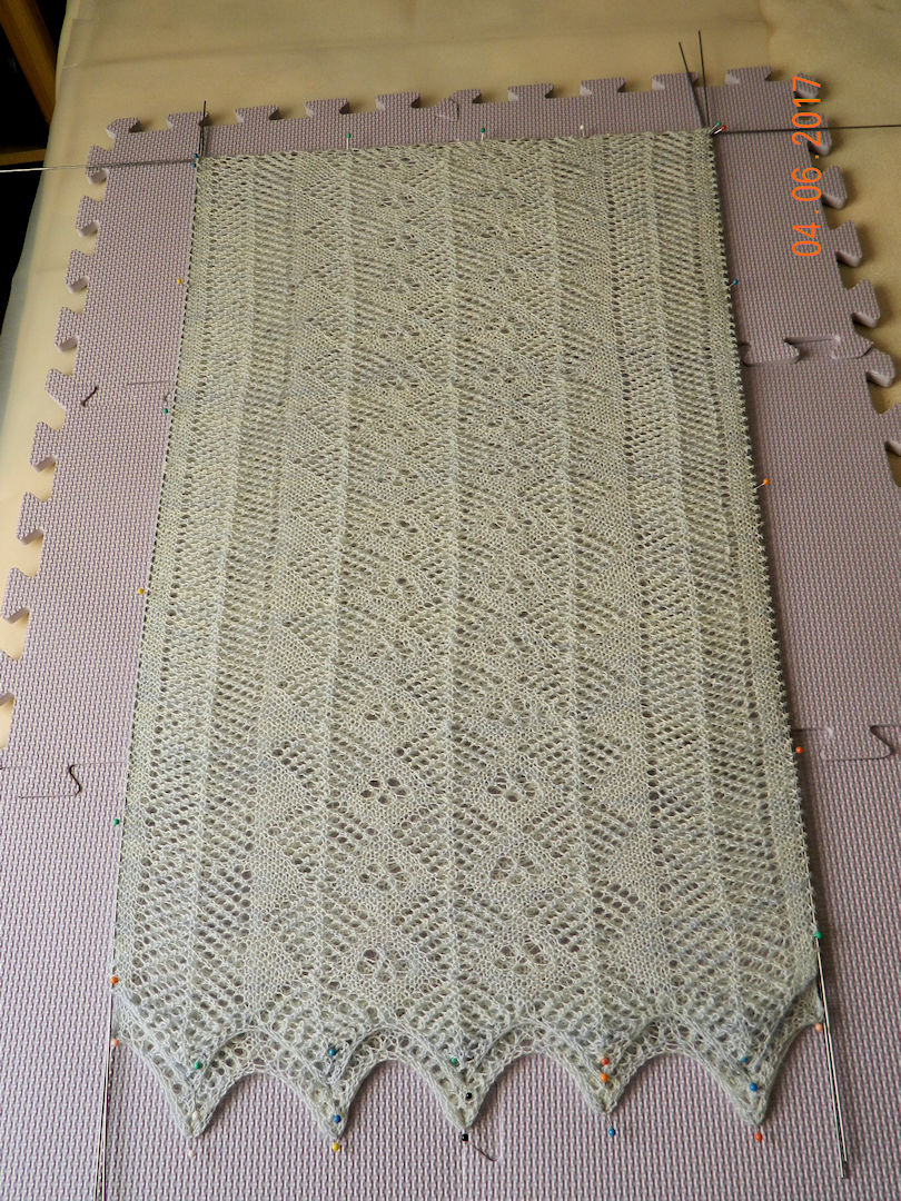 When knitting is finished the first step for a lacy scarf is to wash it and then stretch it out with wires and pins to dry. This is called "blocking." (04:06:2017)