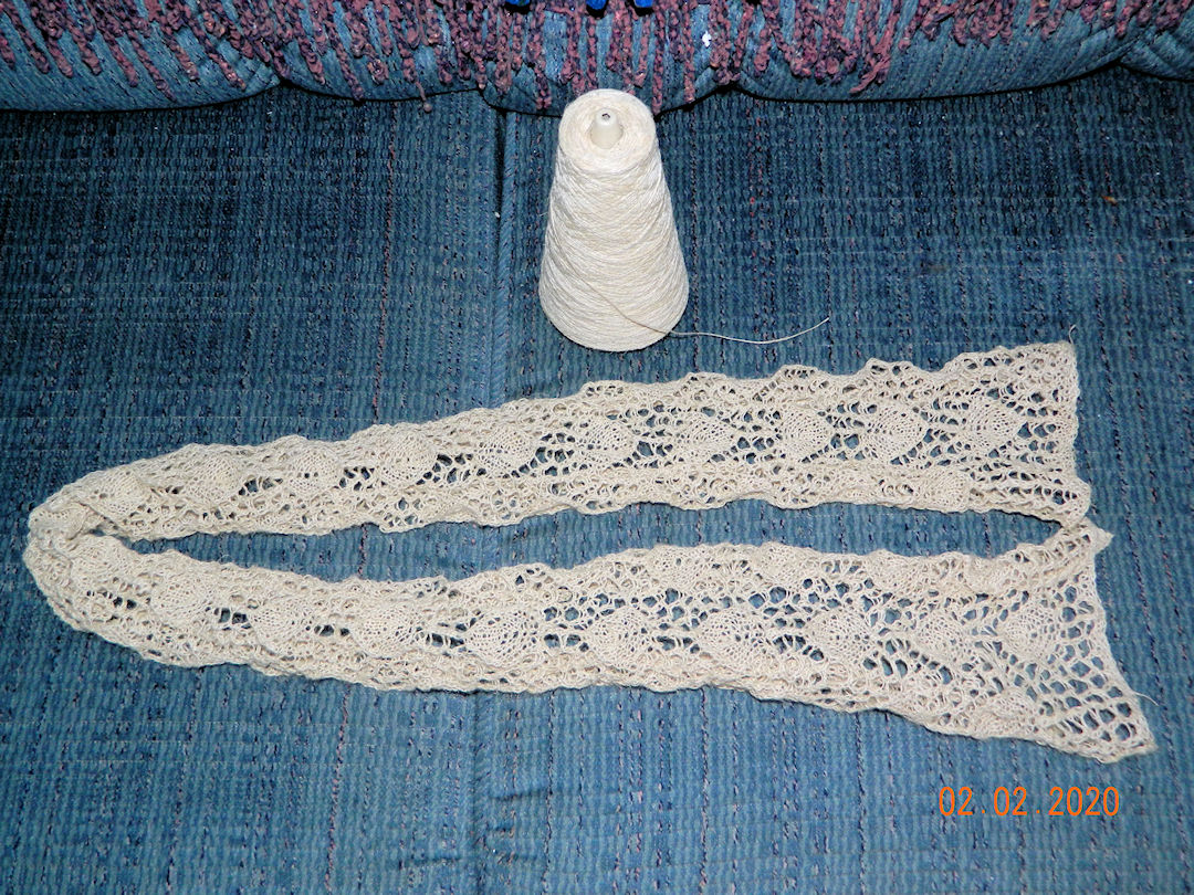 Last summer I tried knitting a scarf from linen yarn. It was so pleasing that after completing a shawl in December I started on another linen scarf. This pattern called for fine silk yarn, so I chose linen about the same grist. If you enlarge the picture you can see the yarn beside the scarf, fresh off the needles, which were only 2 mm diameter.