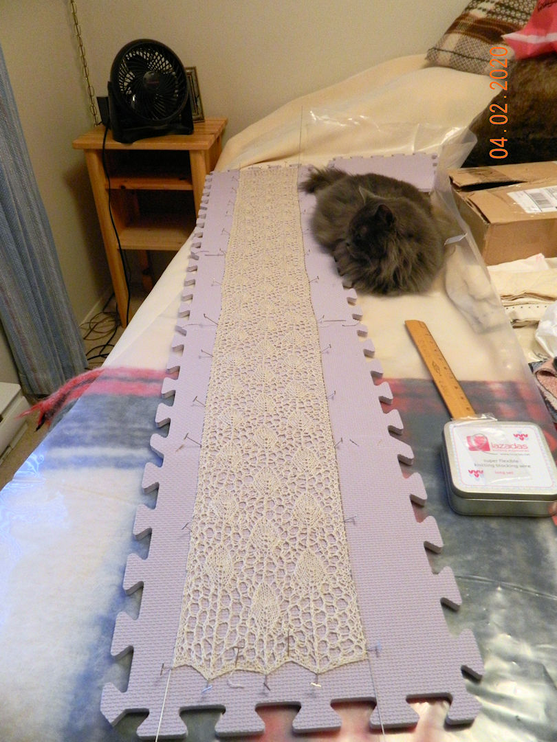 Being linen, it went into the washing machine in hot water before being pinned out for blocking. Of course I had "help" with this job.