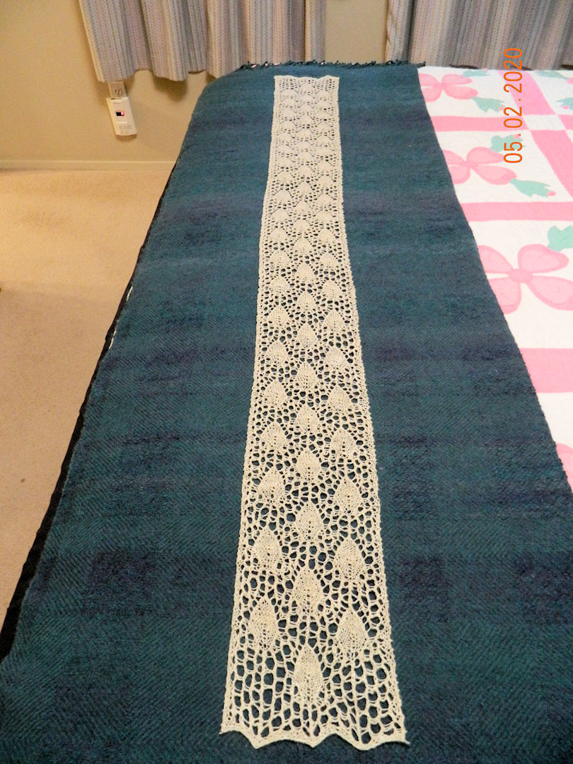 The pattern is "Blue Vinca Scarf" in New Vintage Lace by Andrea Jurgrau. If I do another I will start at both ends and graft it in the middle so the ends match.