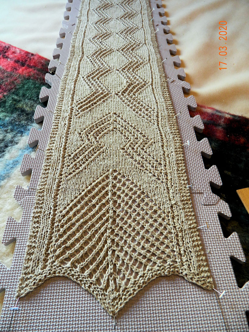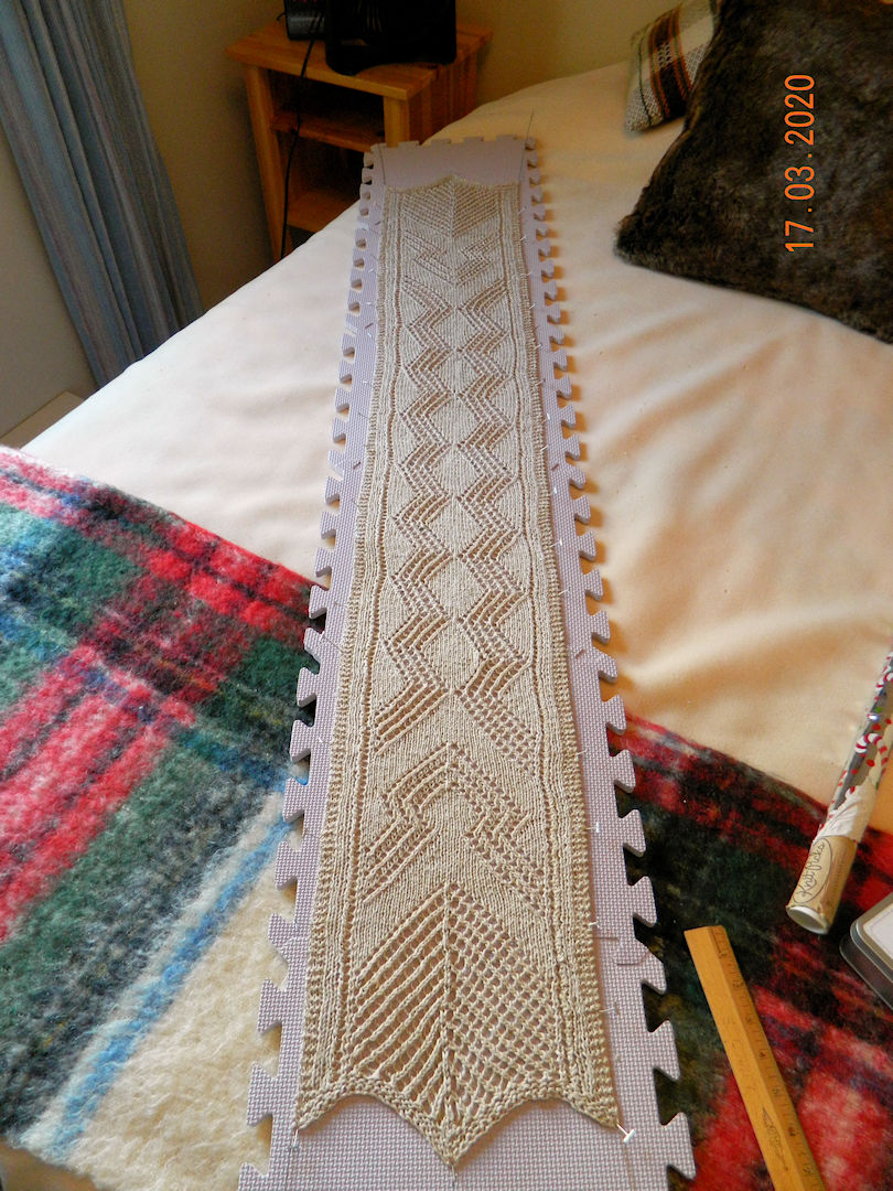 After a wash in hot water it was pinned out for blocking - 60 inches long and 9 inches wide.