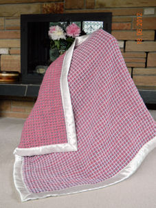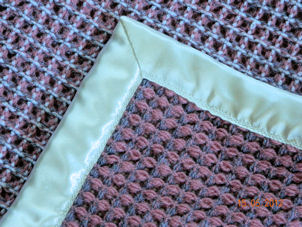 Both blankets now have satin bindings applied. Here is a close up showing both sides of the waffle blanket.