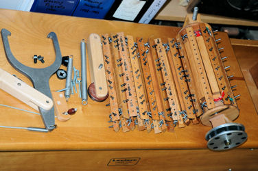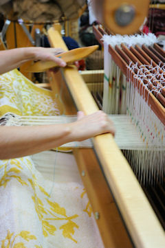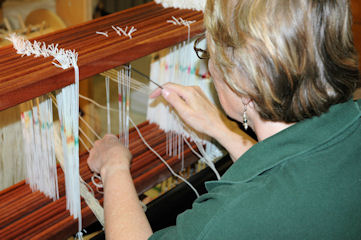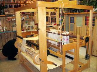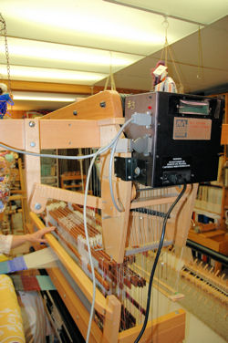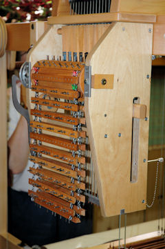 A mechanical computer! This is a "dobby" that controls which shafts are lifted for each "shot" of the weft threads. They are hard to see, but there are small pins, one for each shaft, that cause the cords that lift the shafts to be caught as the weaver stomps on the treadles. (Oct 6, 2007) |