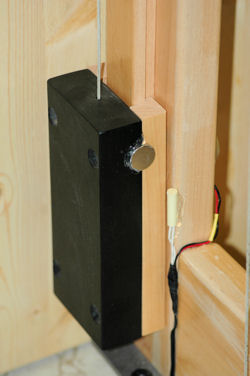 The rare earth magnet trips the micro switch (the sort used in door alarm systems). When tripped it sets off a annoying buzzer mounted at the end of the red wire, that alerts Sheila to raise the cloth take up weight before it hits bottom and stops doing it's job. (Nov 25, 2007) |