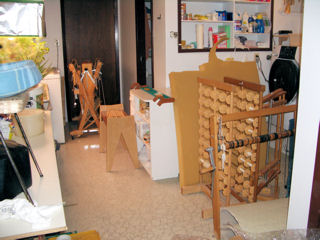 A couple of weeks later, the existing loom (spool racks, benches, cat beds, stools etc) moved to the laundry room, to make space for construction. (Oct 2, 2007) |
