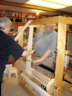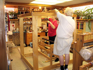 Laura Fry, happened to stop by on her way home from a spinning workshop, and got put to work. This is about 10:00 pm on October 1! Up, and partianly warpped. One small problem with the shafts to resolve before threading can begin. (Oct 2, 2007) |