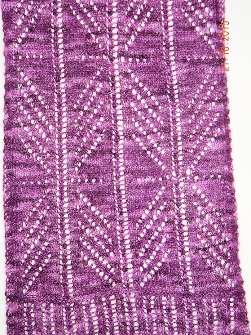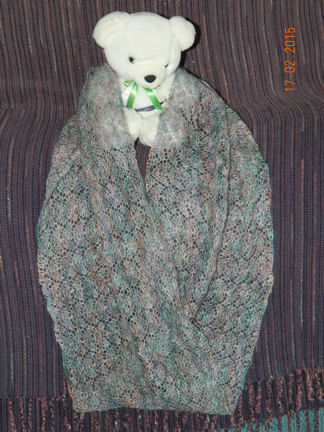 | After about eight months of on and off knitting - a new lacy scarf - a Mobius loop knit round and round from the center out.  The yarn is hand dyed baby alpaca. Click here for more pictures. |  | |||