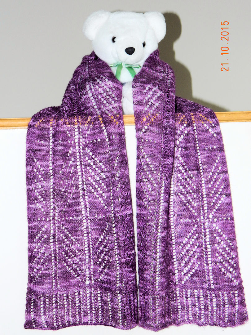 | For Christmas 2013 our grandson Dan gave me a skein of hand dyed yarn made from baby alpaca, silk and cashmere.  Think as soft as you can imagine!  I started knitting in July but just finished it October 19th. Here it is being shown off by my favourite model. The close-up at the right is closer to the actual colour. The pattern, called Skeleton Scarf, comes from a book titled Arctic Lace. It was inspired by the painting of a skeleton on a wooden spoon by the Yup'ik people of Alaska. |     | |||