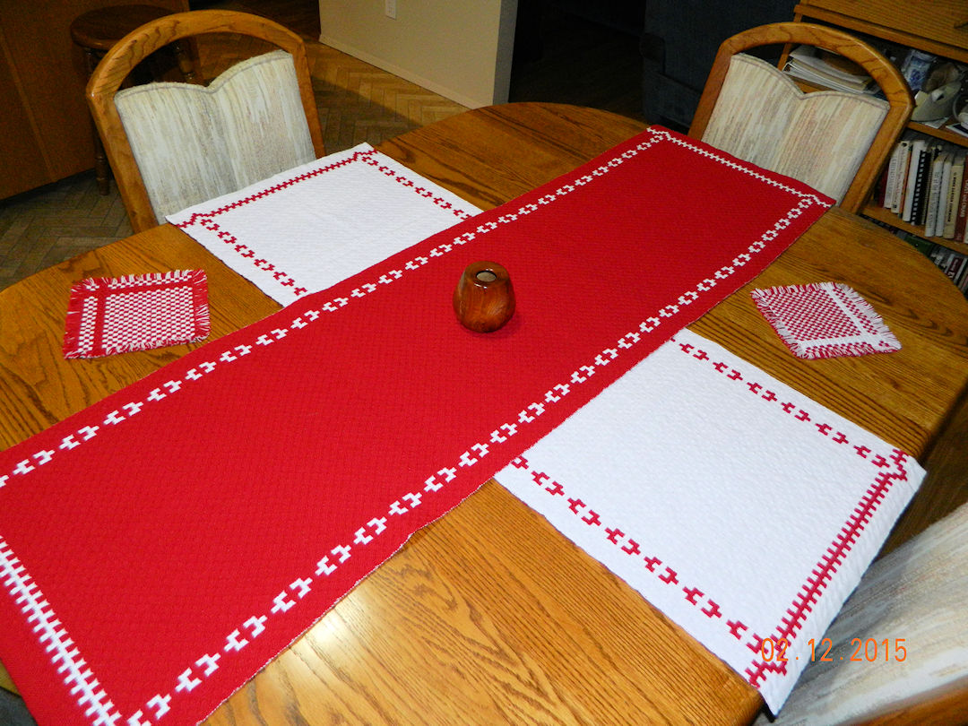 |  | There was still about six yards of warp on the loom when I finished the exchange runner, so weaving continued with two more table runners and some place mats. Click here for more pictures. | |||