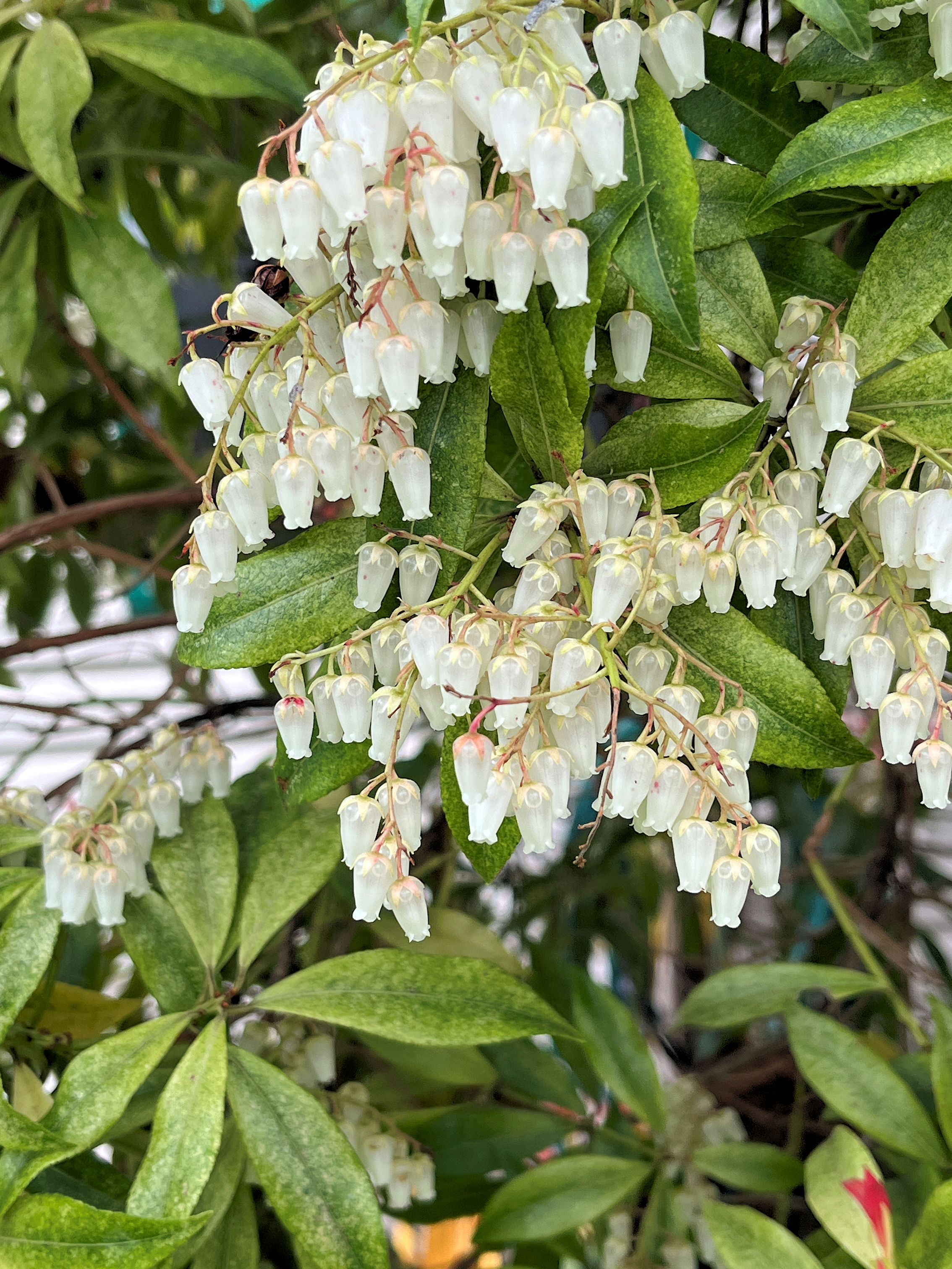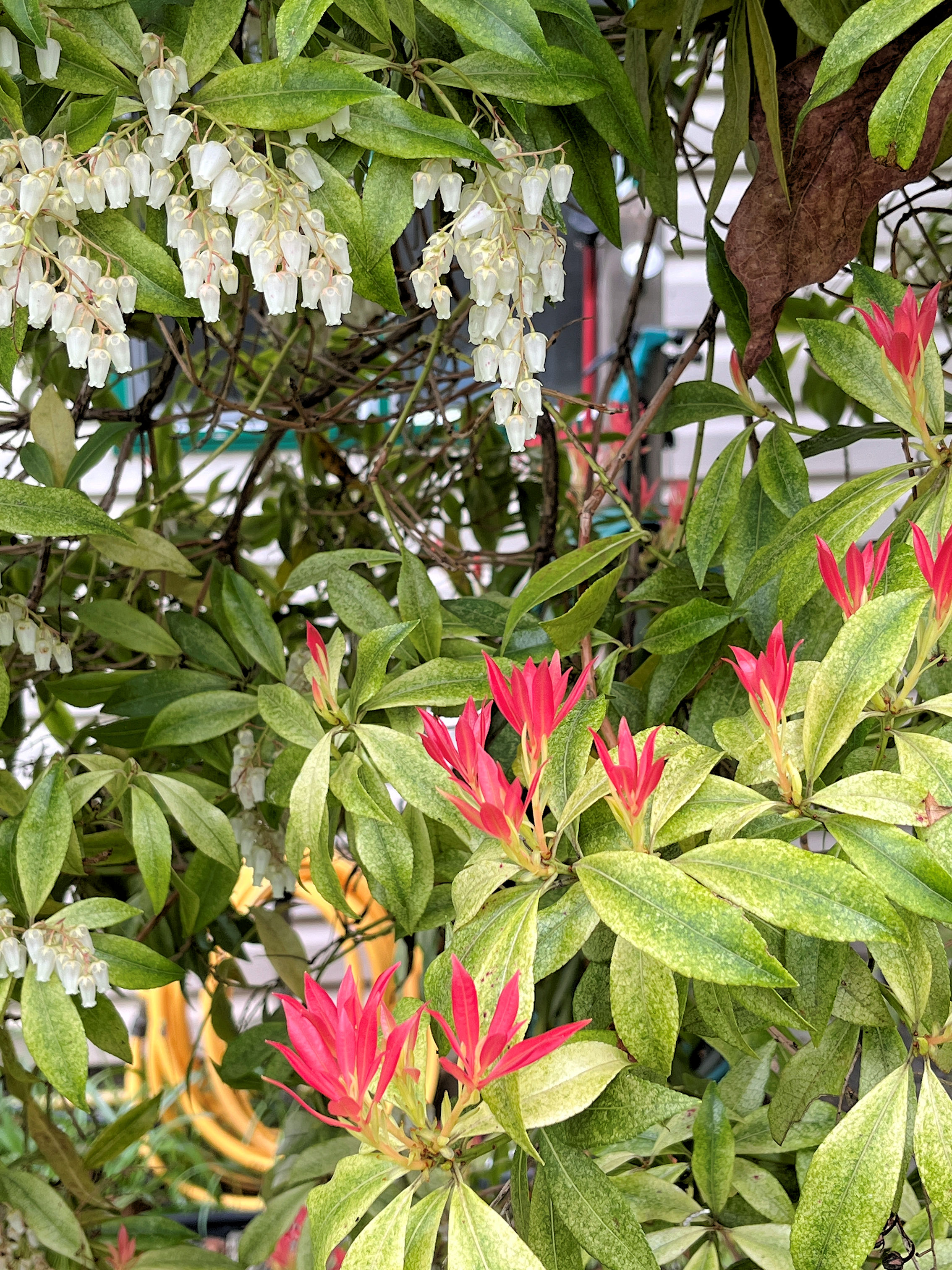 The Pieris with the white blossoms has bright red new leaves. (09:04:2025) |