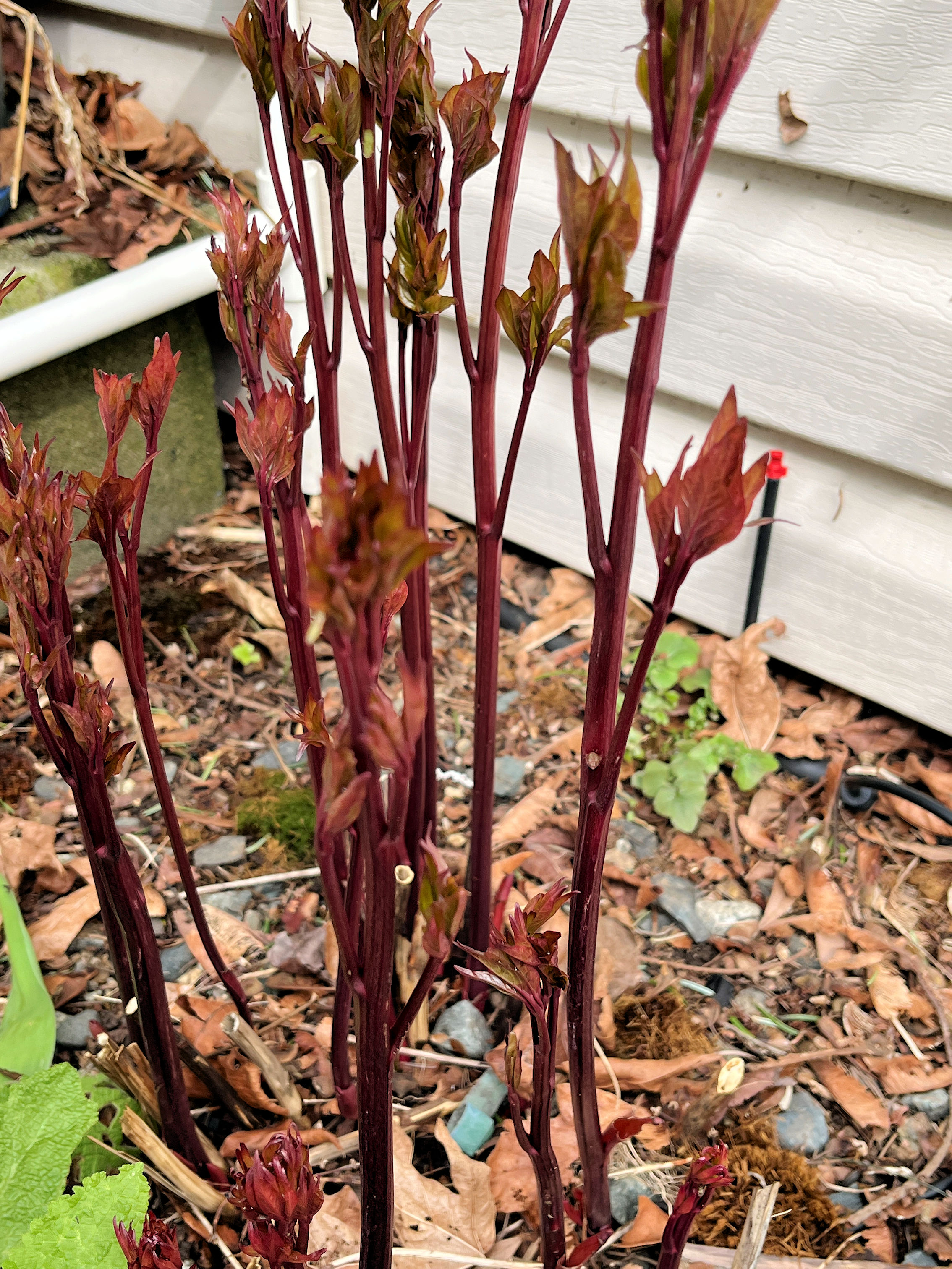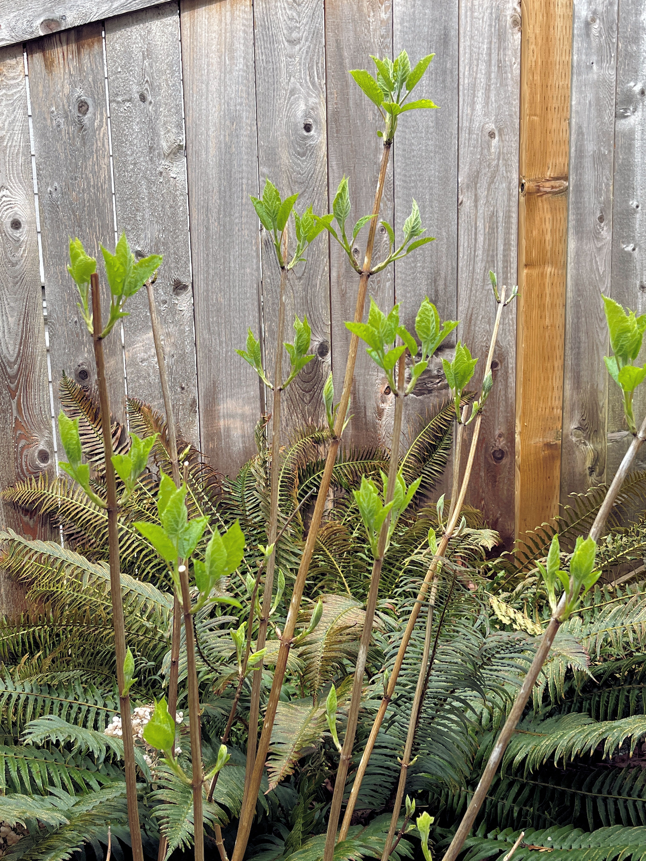 The pompom hydrangea at the west side of the house is leafing out. (09:04:2025) |
