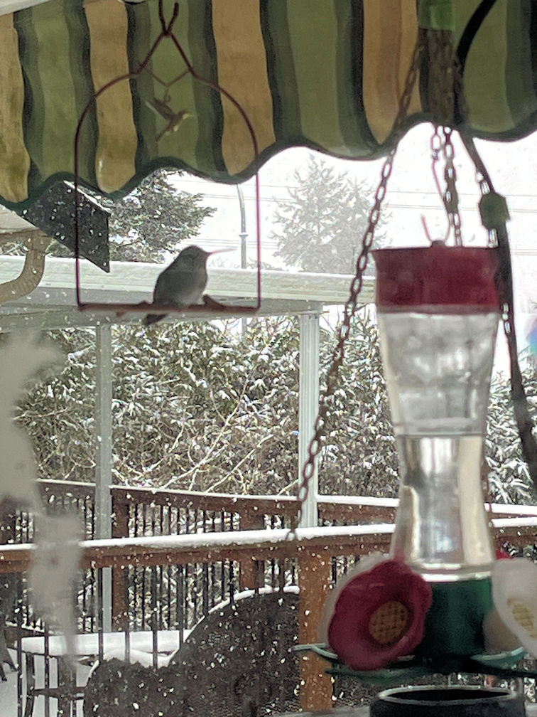 The Bird Hanger! Is a Christmas present this year, and we never figured it would be of any interest to our opinionated birds. Everybody seems to take a short stop on it the check out the lay of the land. This hummer has discovered that it is in a warm spot by the heated feeder. (03:02:2025) |
