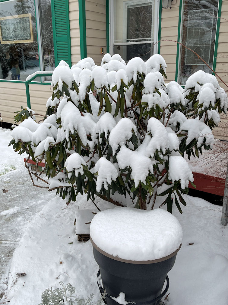 The rhododendron folds its leaves down in the cold but is happy that there is some snow cover. (04:02:2025) |